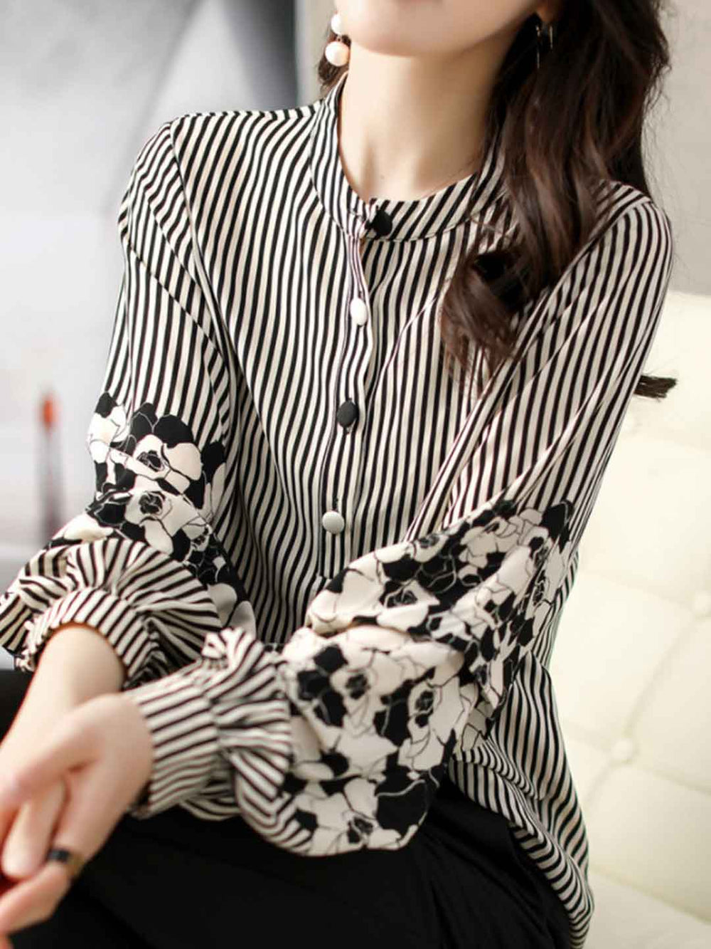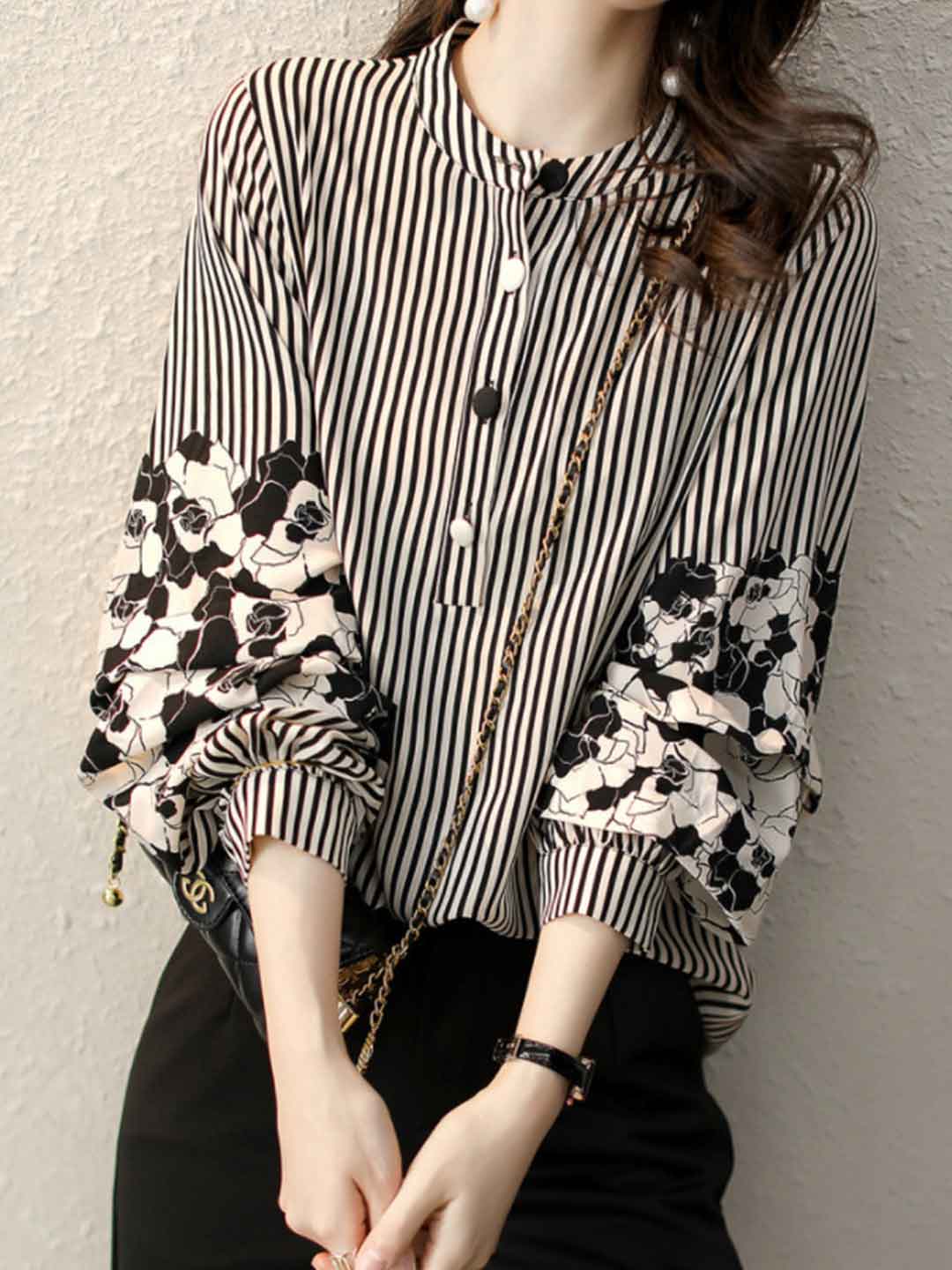 Khloe Classic Lapel Puff Sleeve Striped Shirt