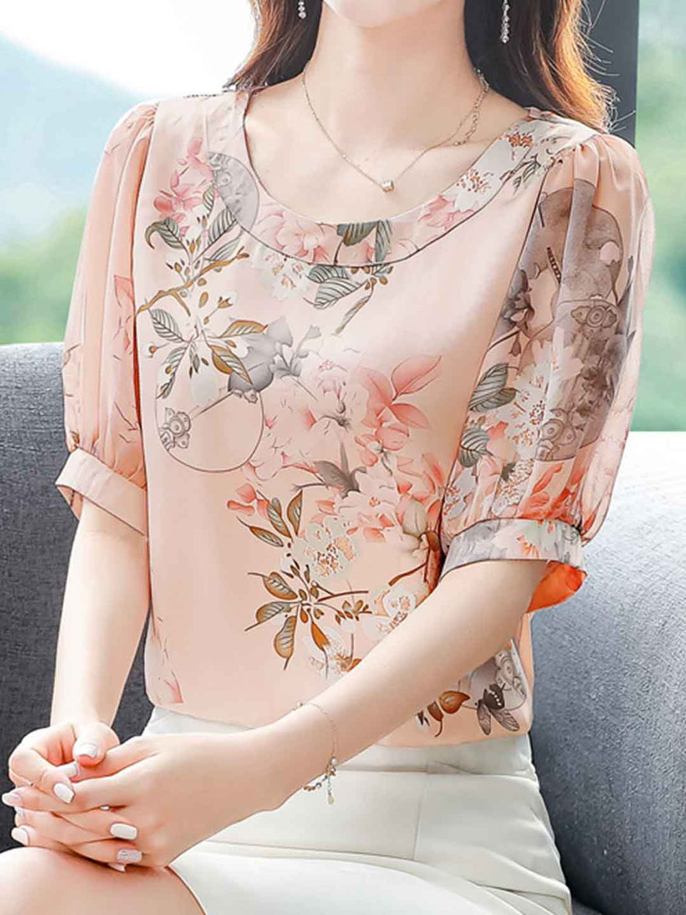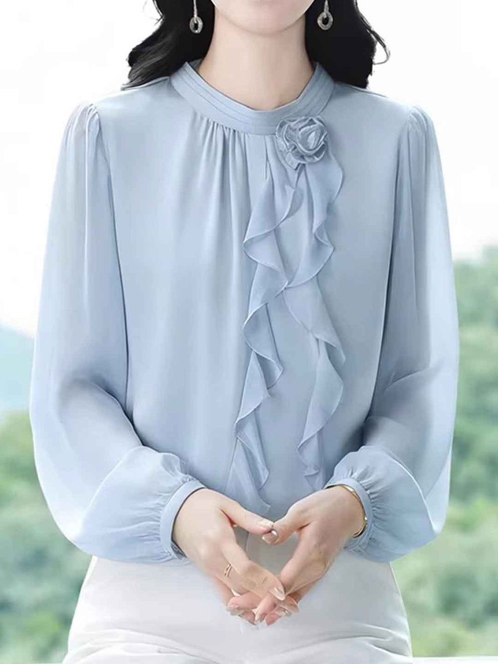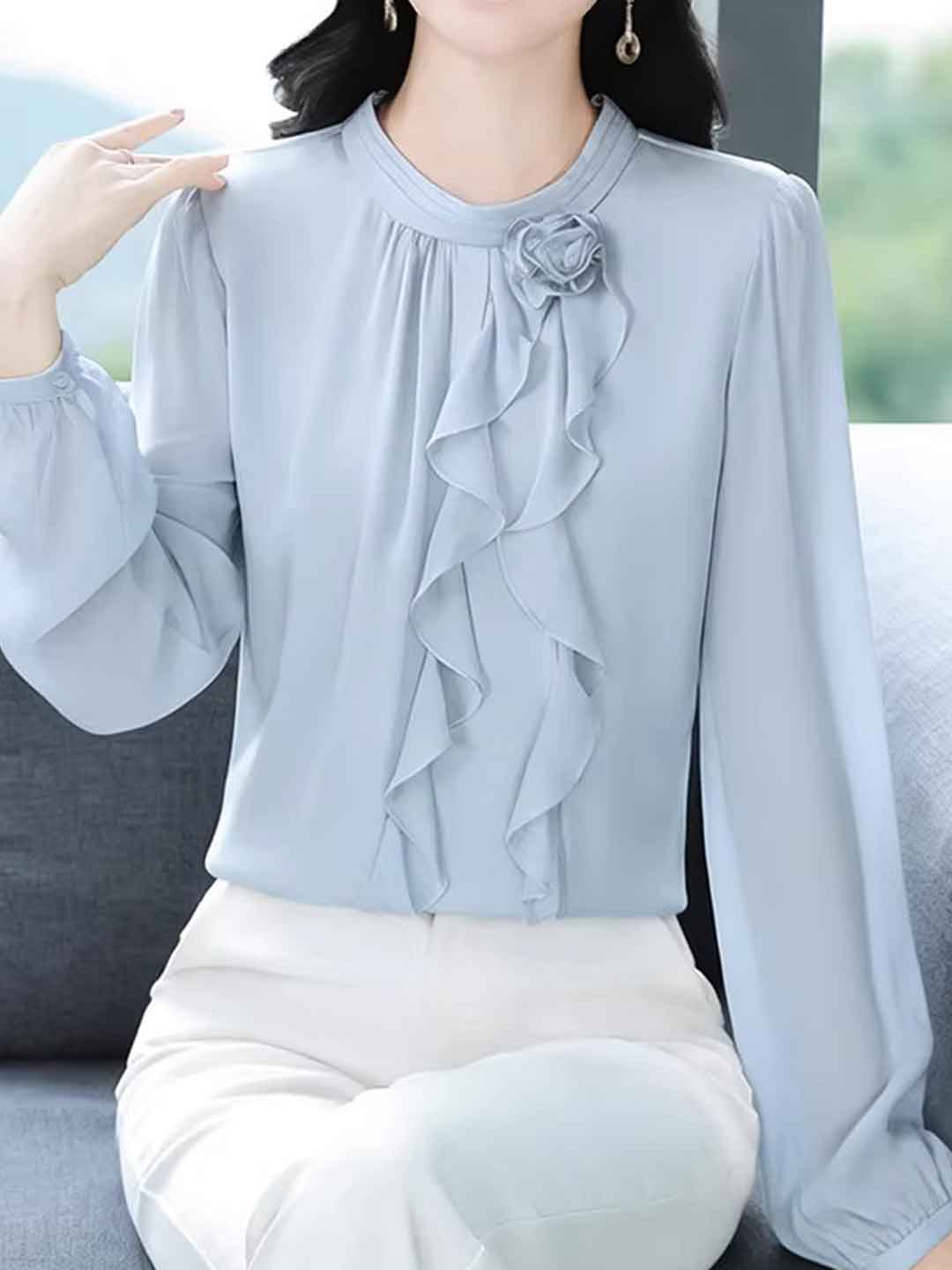 Lillian Elegant Crew Neck Lantern Sleeve Chiffon Shirt