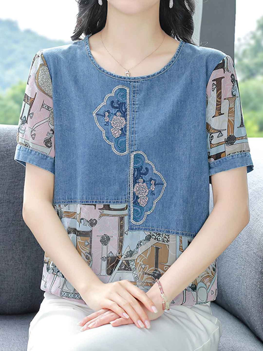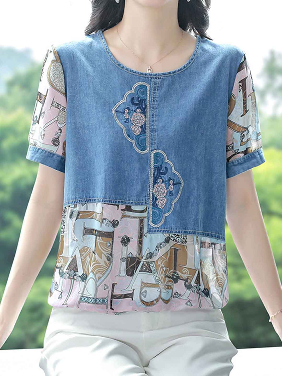 Olivia Loose Crew Neck Embroidered Denim Patchwork Top