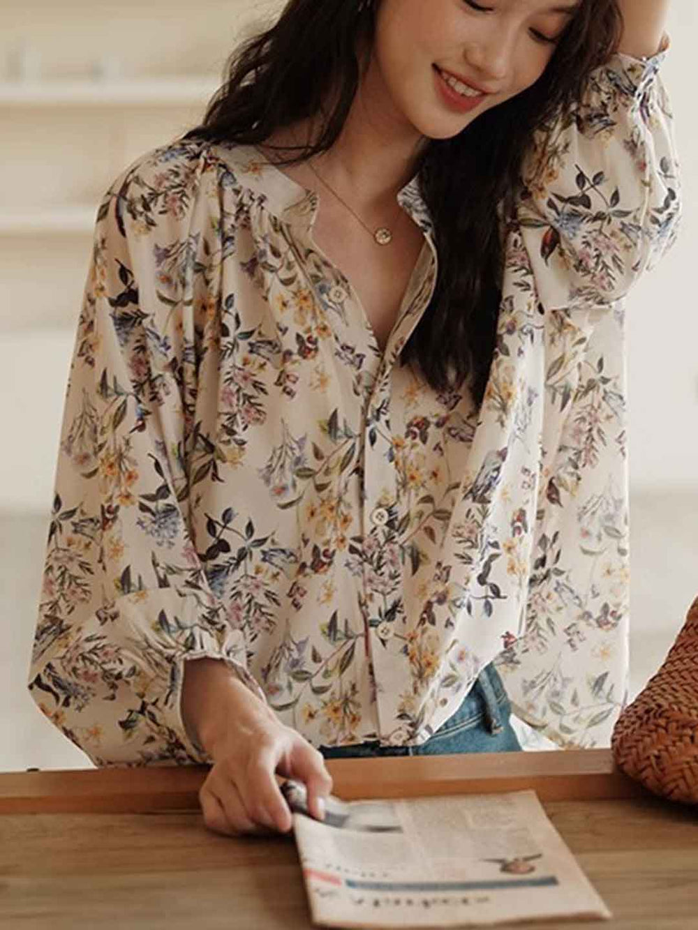 Nevaeh Retro V-Neck Ruffle Floral Blouse