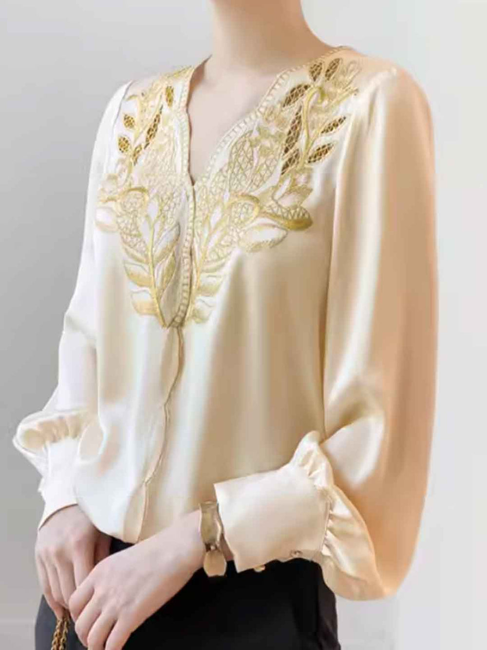 Abigail Classic V-Neck Lantern Sleeve Embroidered Top