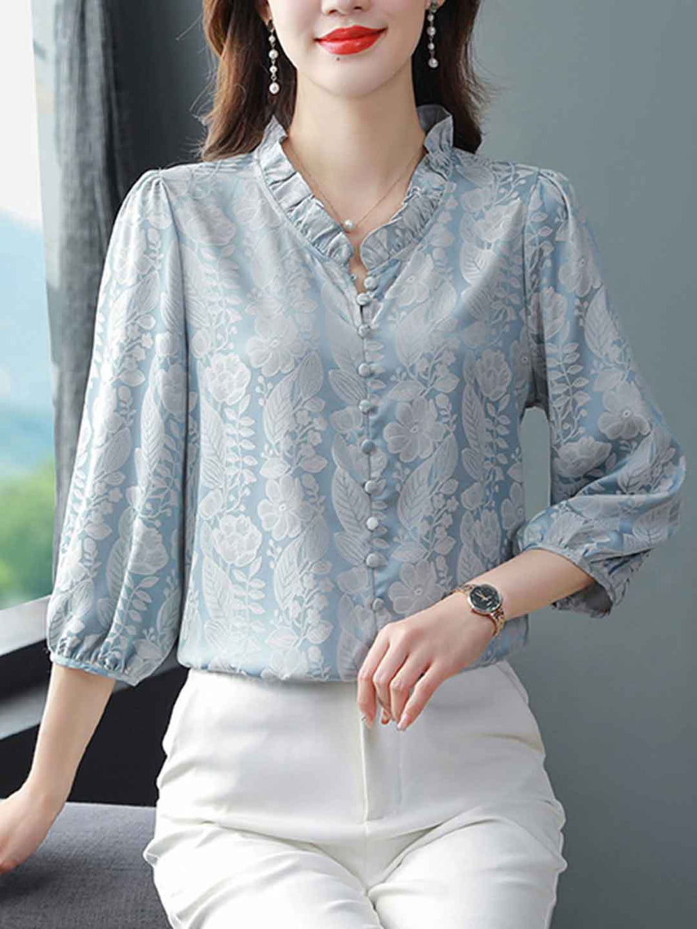Peyton Classic V-Neck Lantern Sleeve Ruffled Shirt