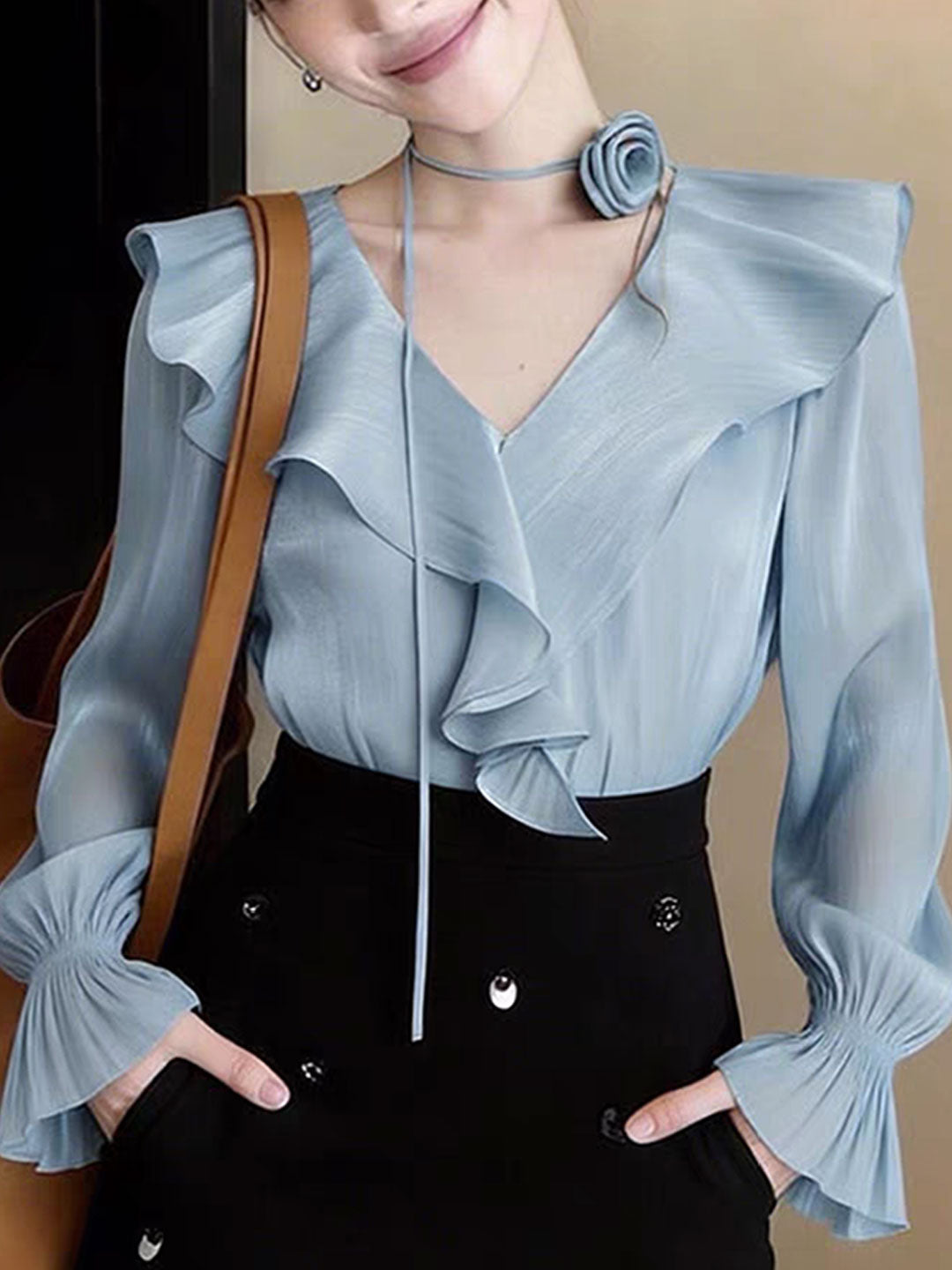 Olivia Lapel Solid Color Satin Ribbon Shirt
