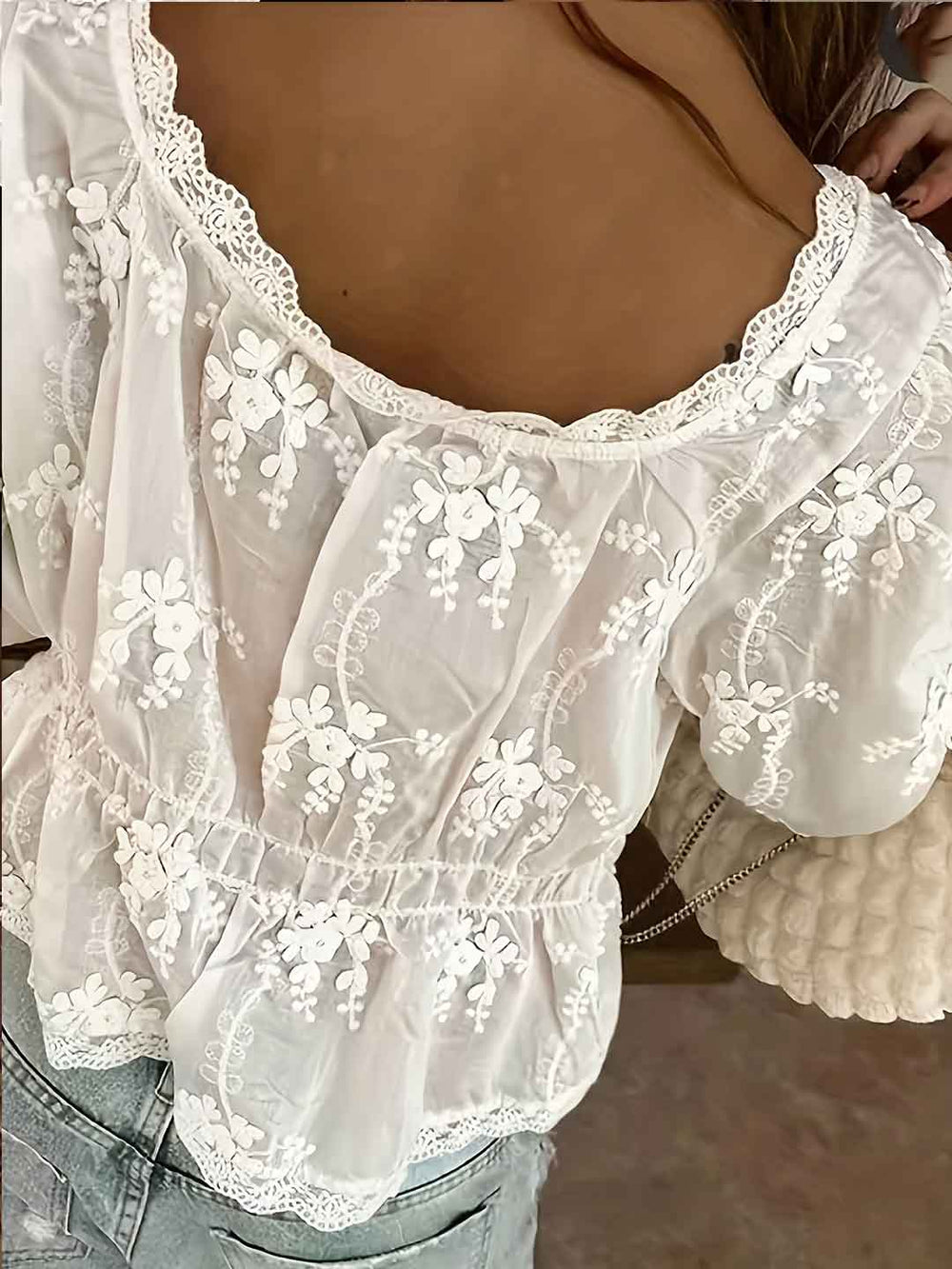 Sophia Retro Lantern Sleeve Hollowed Embroidered Top
