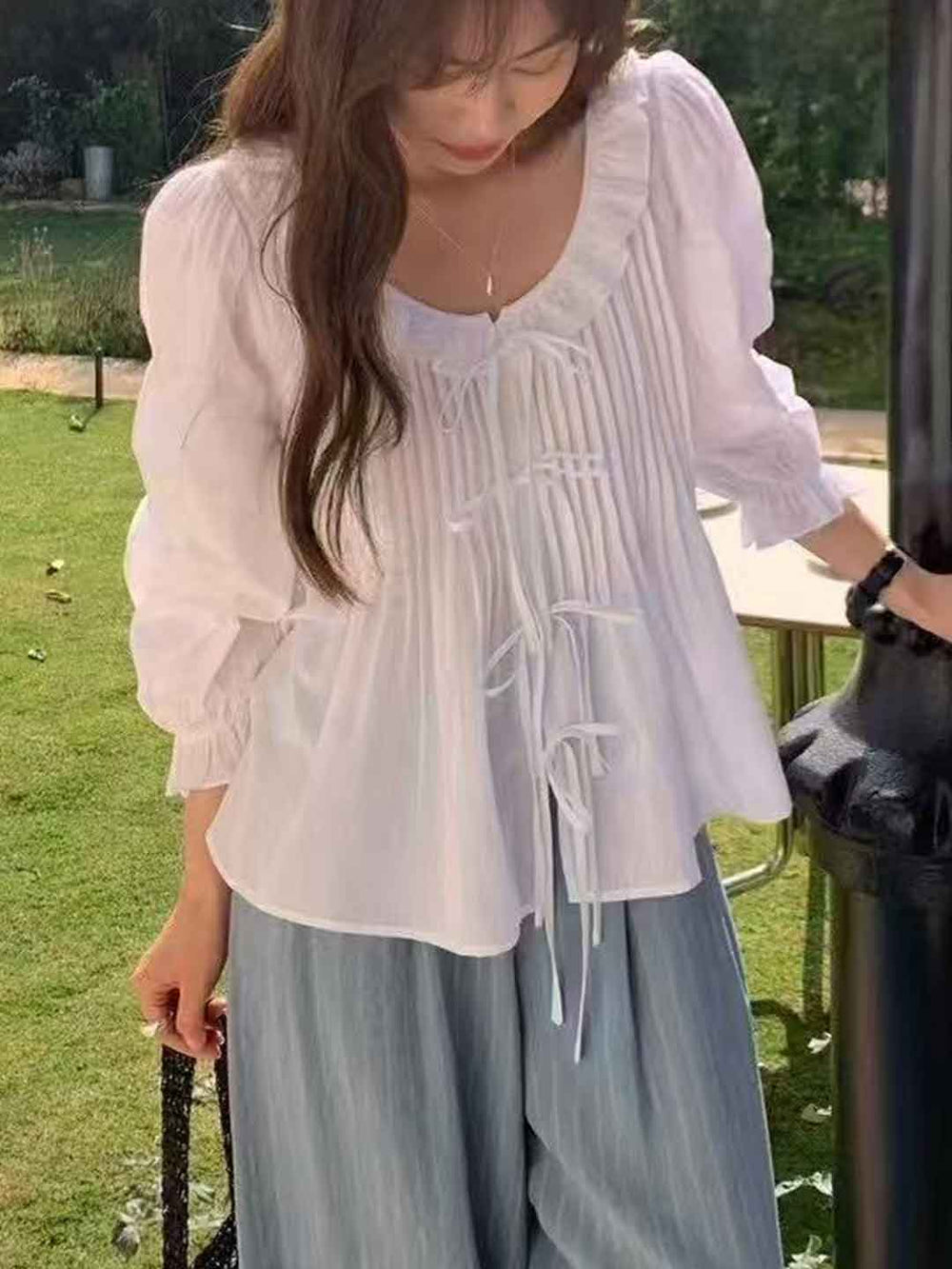 Olivia Loose V-Neck Lantern Sleeve Drawstring Lace Top