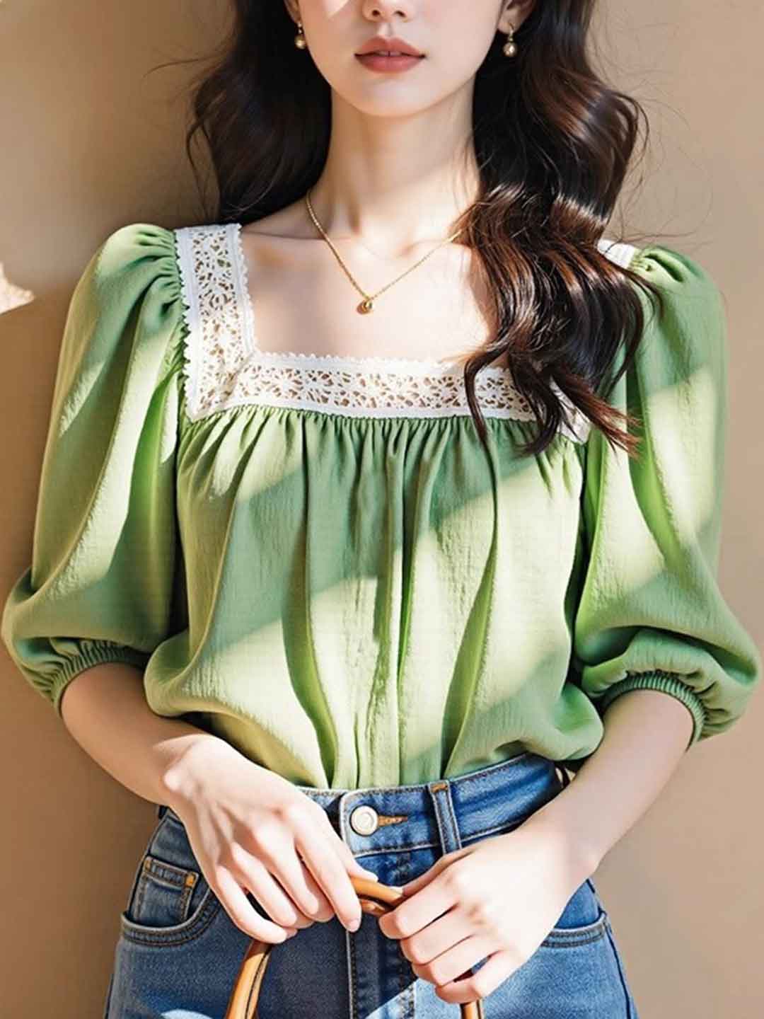Olivia Loose V-Neck Lantern Sleeve Drawstring Lace Top