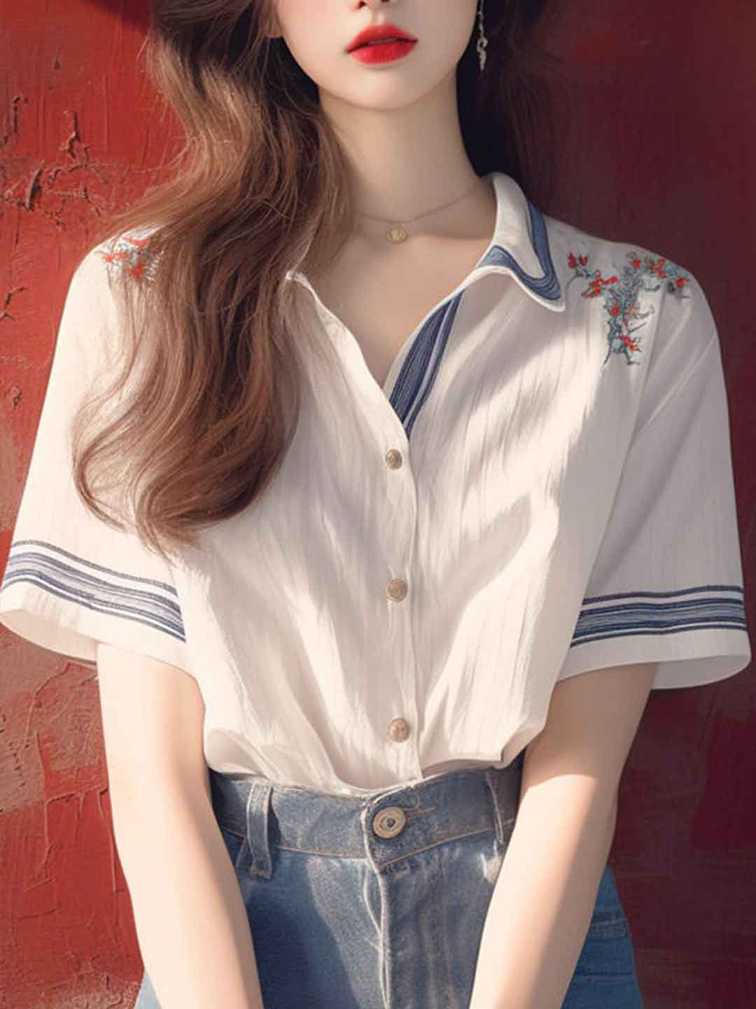 Savannah Loose Polo Collar Embroidered Top