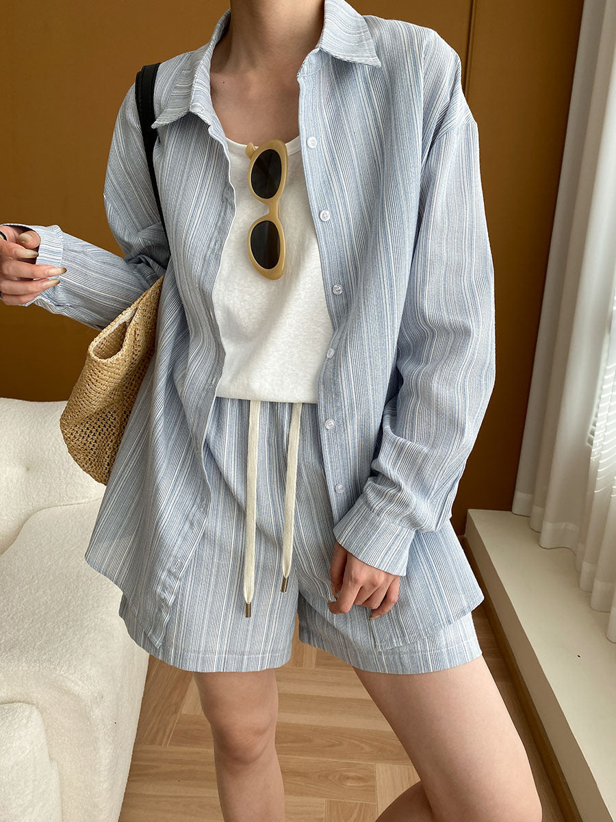 Mariah Casual Lapel Textured Striped Shirt And Shorts Set