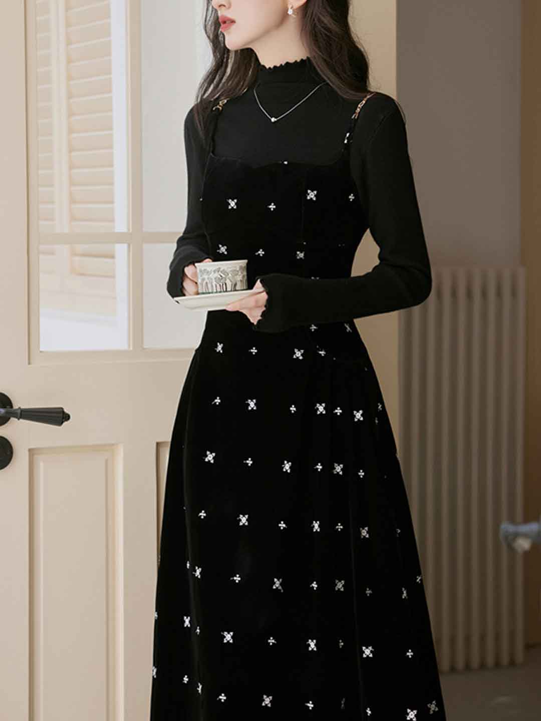 Kayla Retro Velvet Embroidered Slip Dress Two-Piece Set