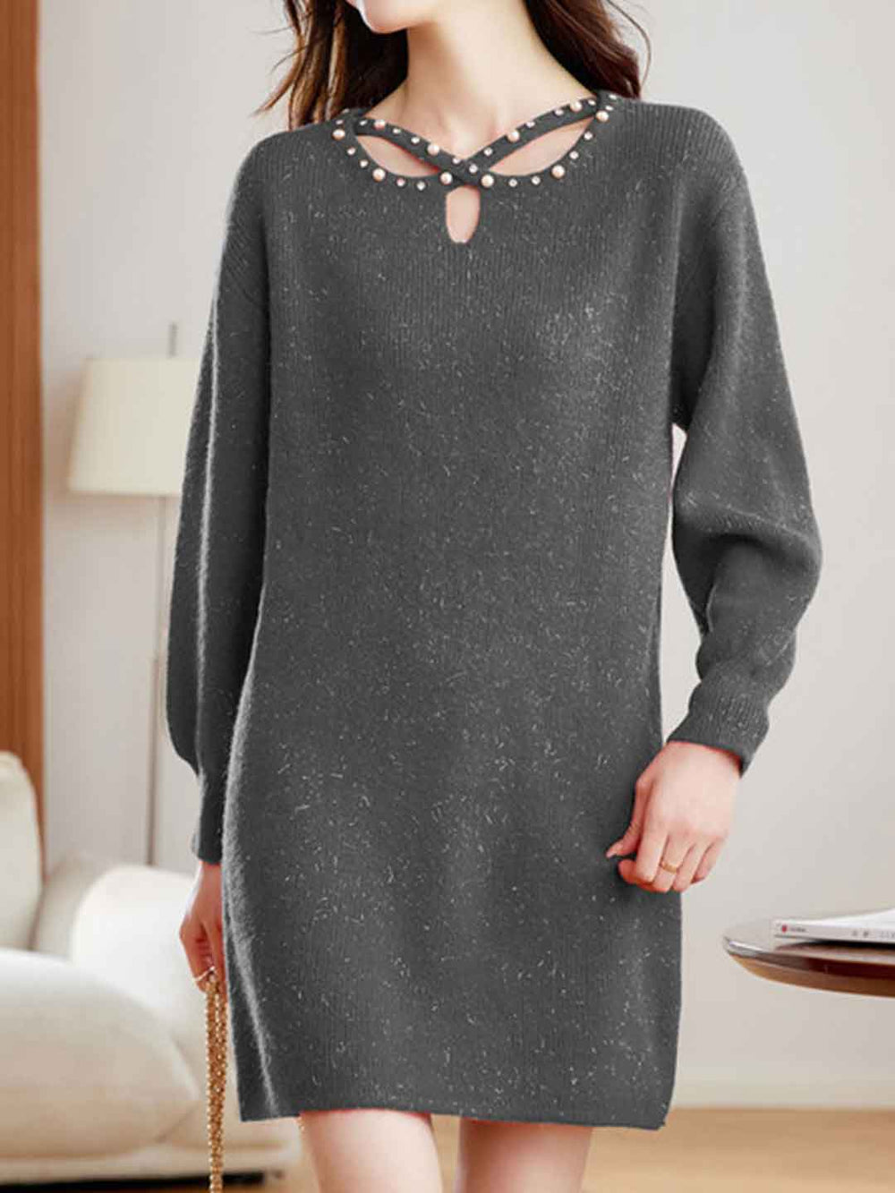 Hannah Elegant Crew Neck Beaded Knitted Sweater Dress