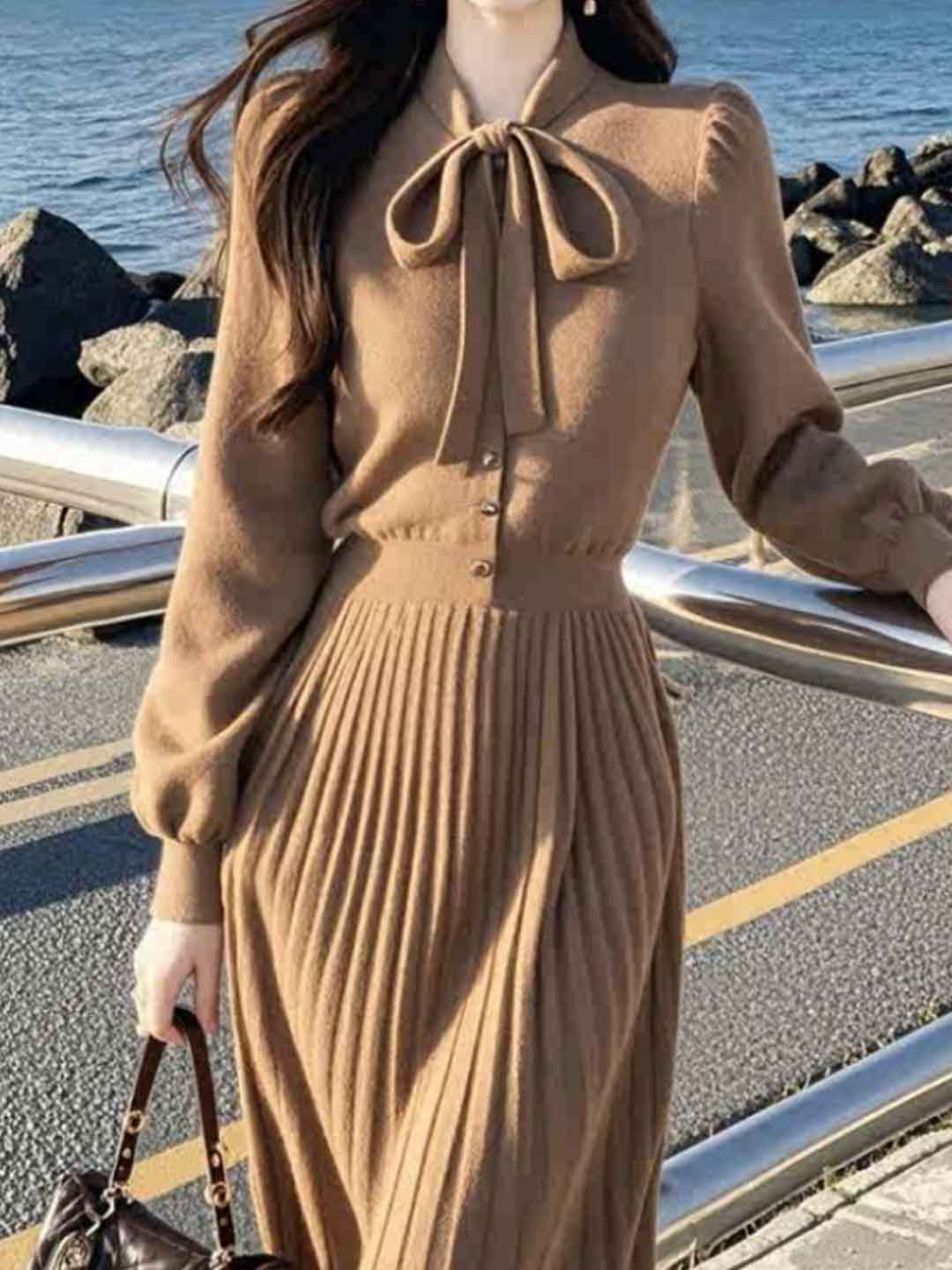 Natalie Elegant Lapel Solid Color Bow Knitted Sweater