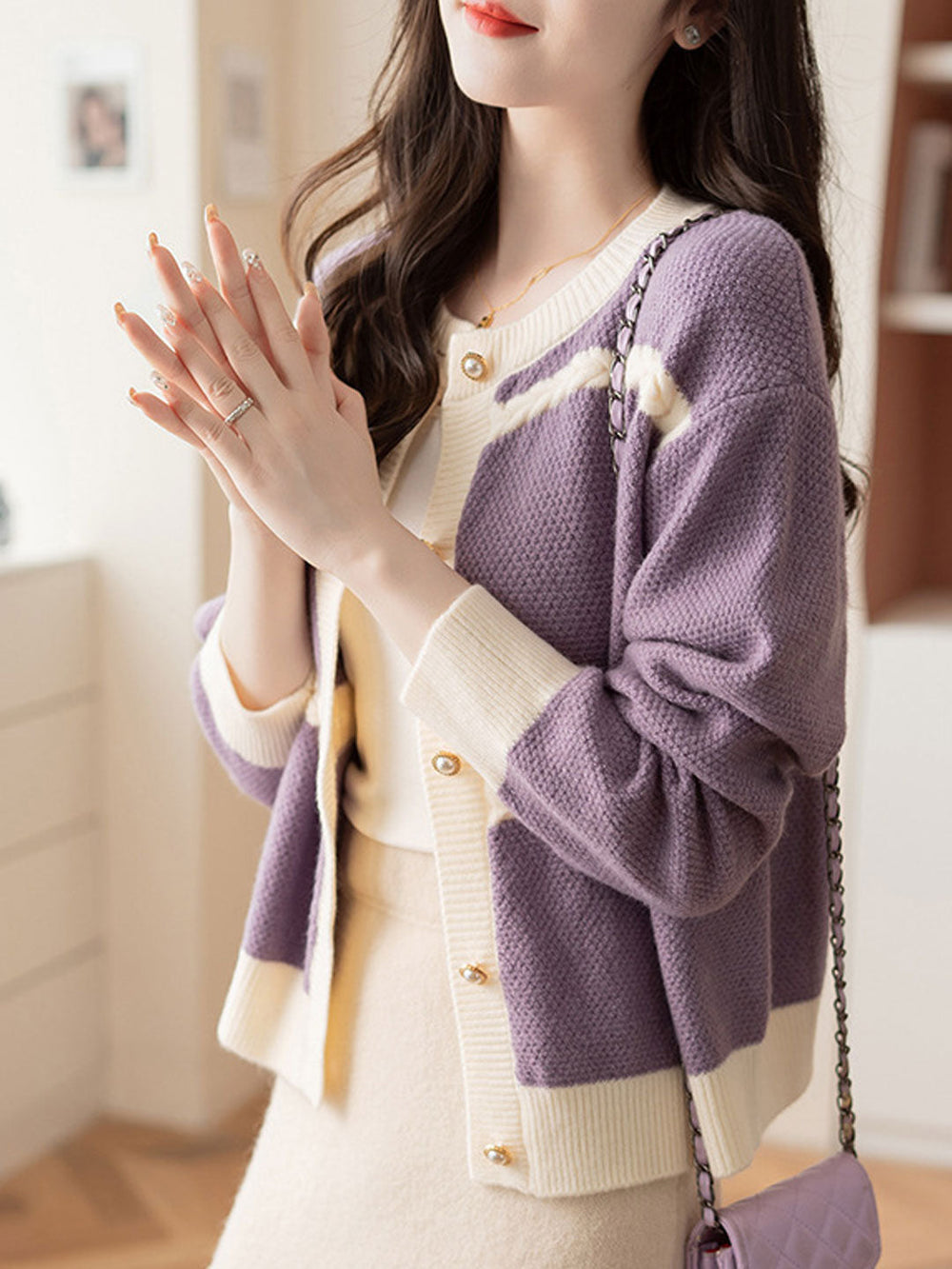 Grace Classic Crew Neck Knitted Cardigan-Purple